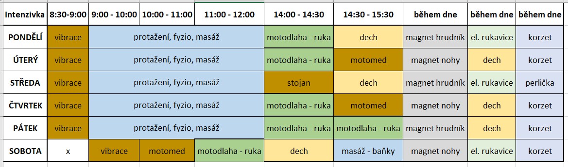Během letních prázdnin máme 2 týdny intenzivní rehabilitace. Ale už kvůli tomu nikam nejezdíme, vše řešíme doma. První týden máme rozpis procedur tak, jak jsme mívali v různých rehabilitačních zařízení (tedy ne státních, tam vám to rozepíší podle toho, kde je místo, nikoli, jak by terapie měly jít za sebou..). Máme tam po ránu uvolnění svalů vibracemi, teplem, pak Petr cvičí 2 -3 hodiny s fyzioterapeutkou, má masáž a doplňkové terapie - magnet, motomed, motodlahy na ruce, dechovou intenzivní půlhodinku, perličková koupel na unavené nohy atd. (příklad našeho týdne níže).